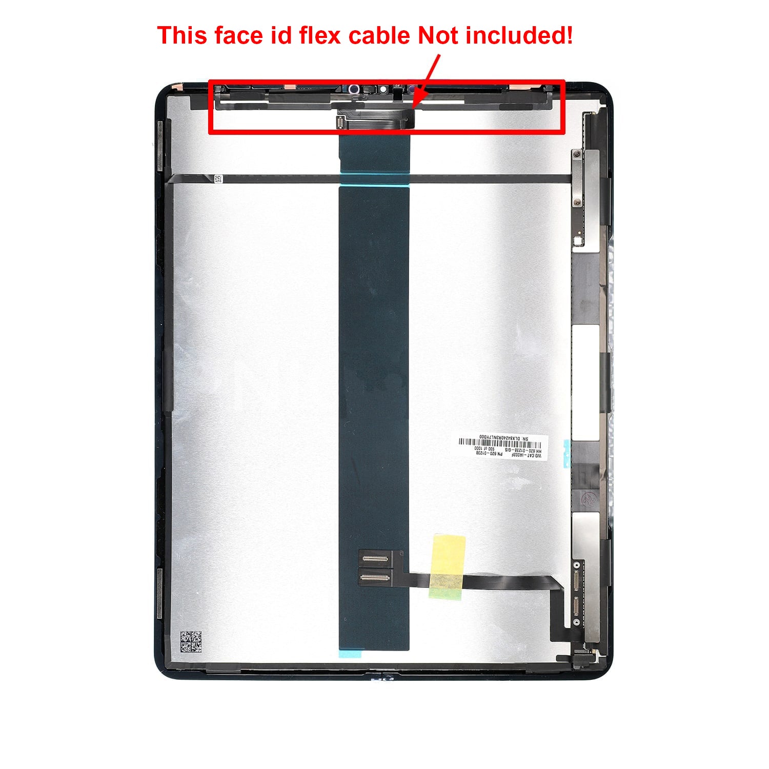 מכלול LCD של Pad Pro בגודל 12.9 אינץ' כולל את תצוגת ה-LCD, מסך מגע Digitizer עם זכוכית קדמית שכבר מחוברת, לא כולל את כבל ה-Face ID Flex בתמונה.